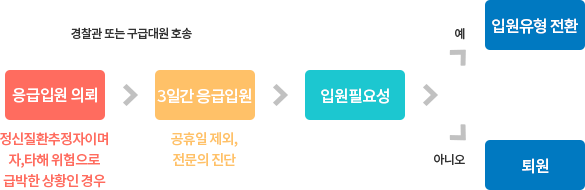 정신질환자로 추정되는 자•타해 위험이 큰 사람을 발견한 사람은 의사•경찰관의 동의를 받아 해당 정신질환추정자를 정신의료기관에 입원을 의뢰할 수 있습니다. 이 경우 3일 이내에 다른 유형의 입원으로 전환하거나 퇴원시켜야합니다.